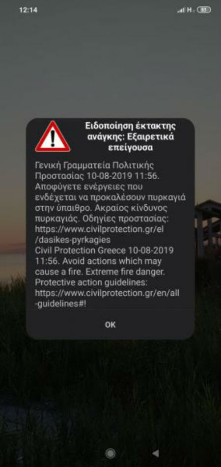 Γενική γραμματεία πολιτικής προστασίας 10-08-2019 11:56. Αποφύγετε ενέργειες που ενδέχεται να προκαλέσουν πυρκαγιά στην ύπαιθρο. Ακραίος κίνδυνος πυρκαγιάς. Οδηγίες προστασίας civilprotection.gr. Το μήνυμα στέλνεται και στην αγγλική γλώσσα.