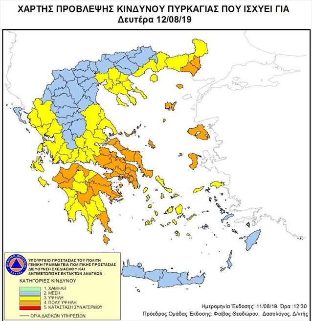 Σύμφωνα με τον Χάρτη Πρόβλεψης Κινδύνου Πυρκαγιάς που εκδίδει η Γενική Γραμματεία Πολιτικής Προστασίας του Υπουργείου Προστασίας του Πολίτη (www.civilprotection.gr ), για σήμερα, Δευτέρα 12 Αυγούστου 2019, προβλέπεται πολύ υψηλός κίνδυνος πυρκαγιάς (κατηγορία κινδύνου 4) για τις εξής περιοχές: