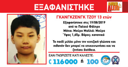 «Στις 19/8/2019, στις 19:30 ώρα, εξαφανίστηκε από το σπίτι του στο Παλαιό Φάληρο, ο Γκανγκζένγκ Τζου, 13 ετών, κινεζικής καταγωγής.