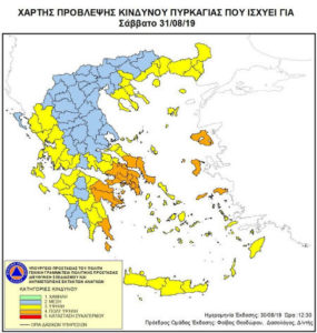 Σύμφωνα με το Χάρτη Πρόβλεψης Κινδύνου Πυρκαγιάς που εκδίδει η Γενική Γραμματεία Πολιτικής Προστασίας του Υπουργείου Προστασίας του Πολίτη civilprotection.gr, για σήμερα Σάββατο 31 Αυγούστου 2019, προβλέπεται υψηλός κίνδυνος πυρκαγιάς (κατηγορία κινδύνου 4) για την Αττική, τη Βοιωτία, την Εύβοια, τη Μυτιλήνη, τη Χίο, τη Σάμο, την Ικαρία, τα Κύθηρα, την Λακωνία, την Αργολίδα και την Κορινθία.